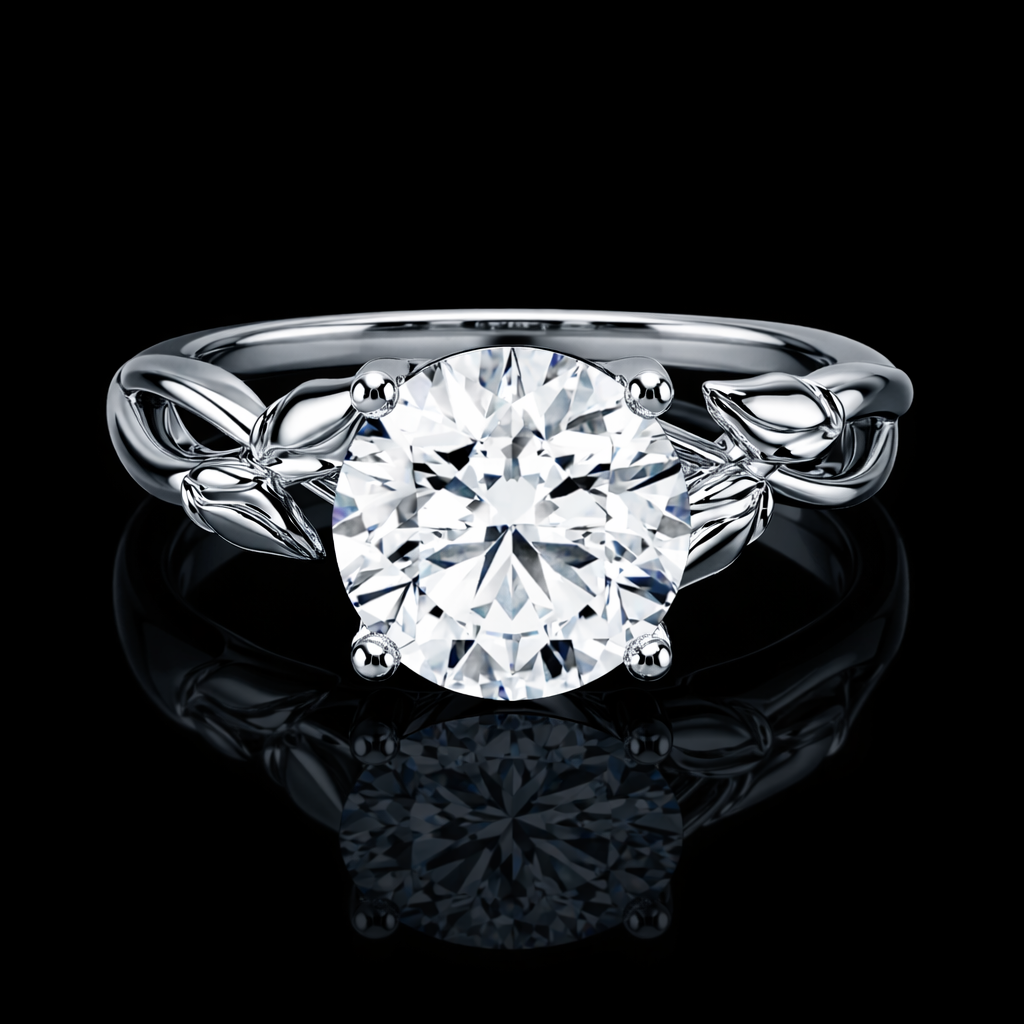 This elegant Lab-Grown Diamond Solitaire Engagement Ring features a timeless round-cut center diamond, beautifully highlighted by a nature-inspired leaf motif along the shank.