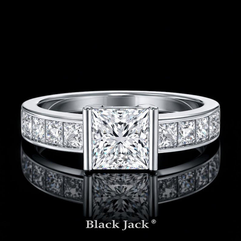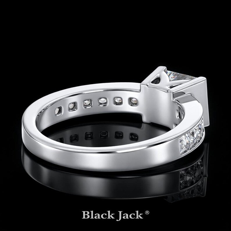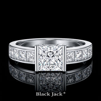 Structured brilliance meets modern sophistication in this Princess Cut Moissanite Channel Set Engagement Ring by Black Jack. Featuring a bold princess cut center stone secured with vertical bar-style prongs and complemented by channel-set princess side stones, this design offers clean geometry and balanced sparkle.
