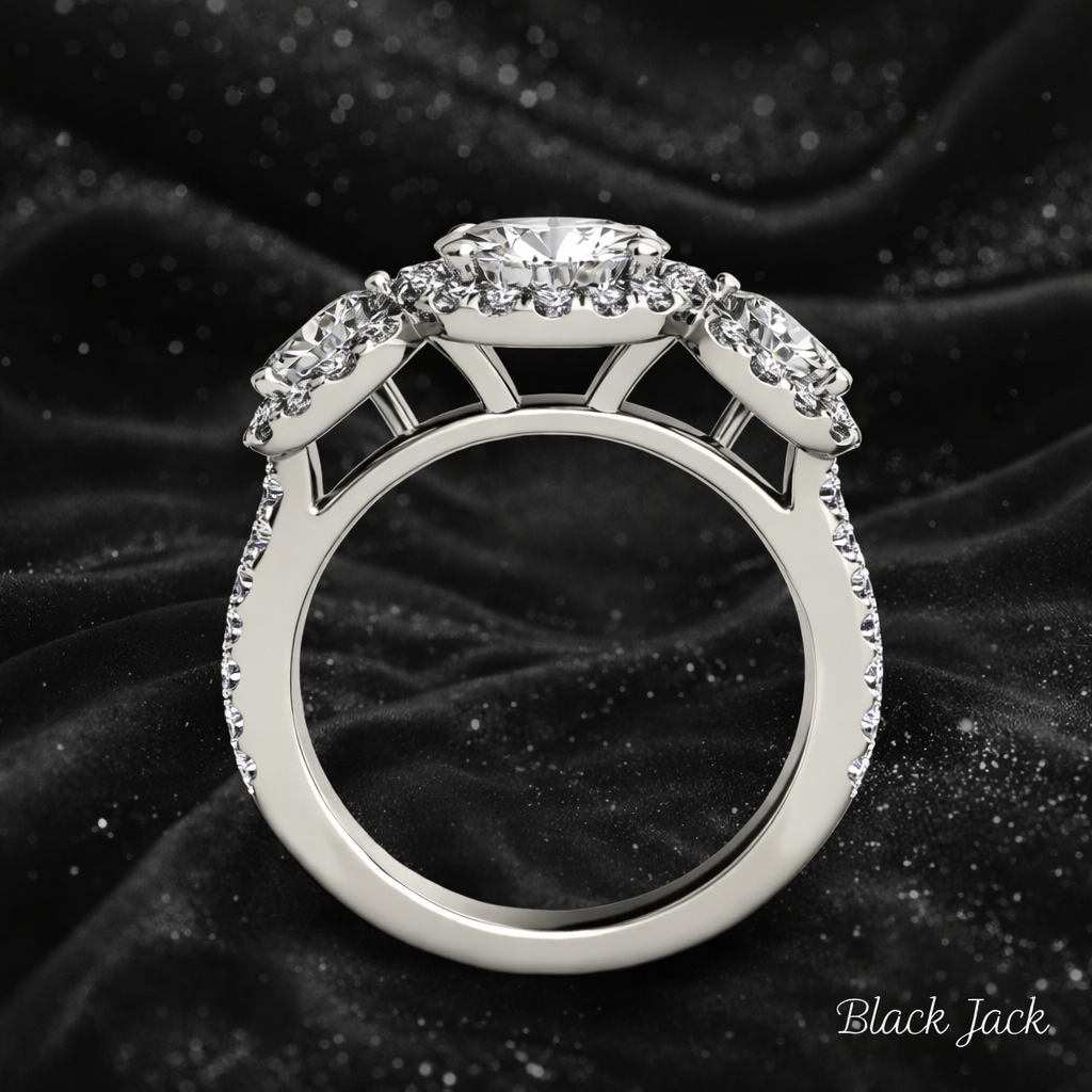 this three stone halo engagement ring is ideal for engagements, anniversaries, or meaningful gifting.
